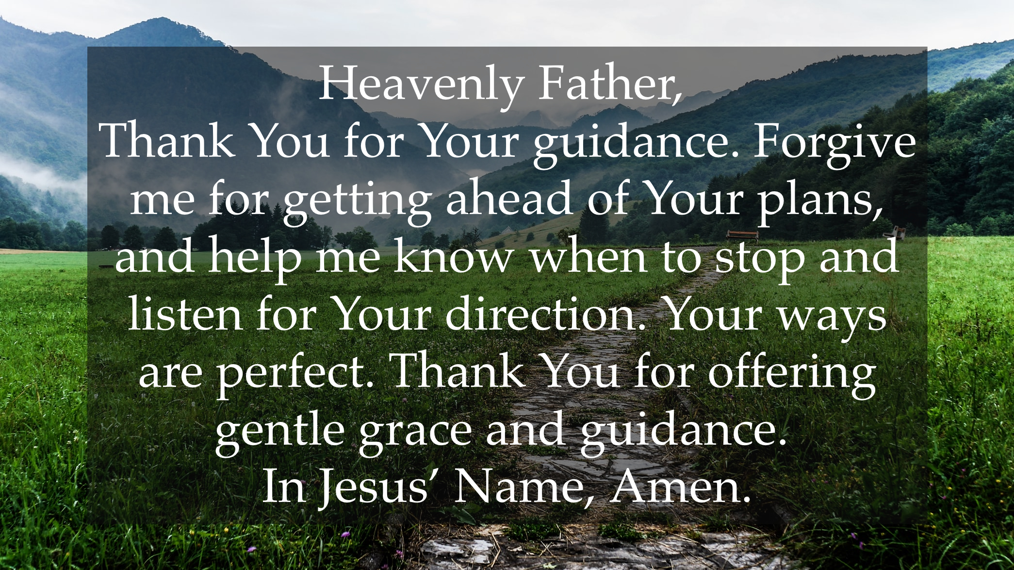 Heavenly Father, thank You for Your guidance. Forgive me for getting ahead of Your plans, and help me know when to stop and listen for Your direction. Your ways are perfect. Thank You for offering gentle grace and guidance. In Jesus’ Name, Amen. - Kristine Brown